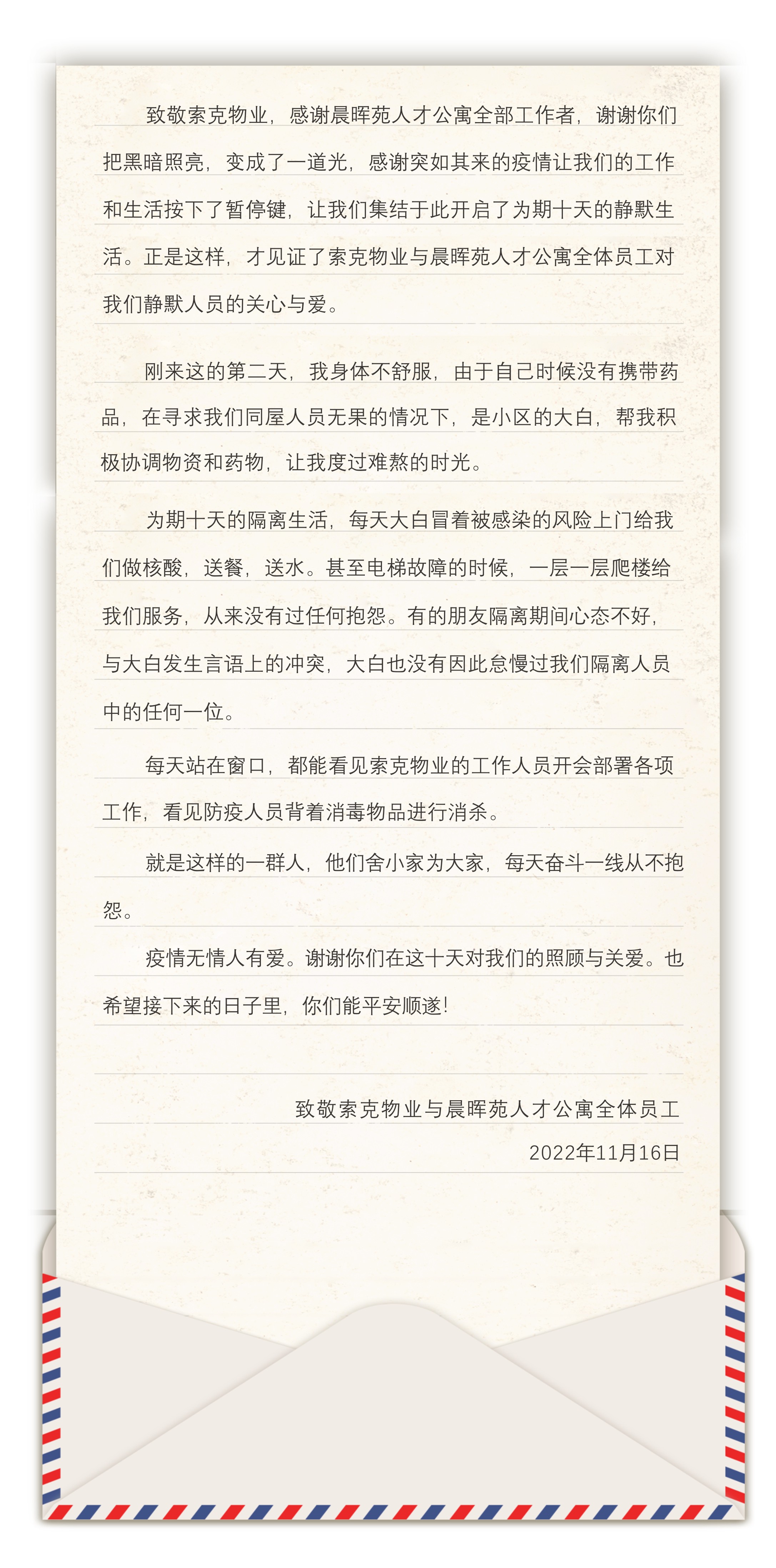 2022年11月中旬,索克住宅事业部晨晖苑隔离点项目迎来重大胜利成果,管理数千名隔离人员已全部解封,业主方也给我公司发来热情洋溢的表扬信,对我公司及项目全体人员的敬业精神给予了高度评价。我项目在配合甲方顺利撤场的同时,又接到一项新的使命:配合郑东新区建投单位承接富士康集团万人招聘的隔离点服务任务,项目部再一次踏上了新的征程。